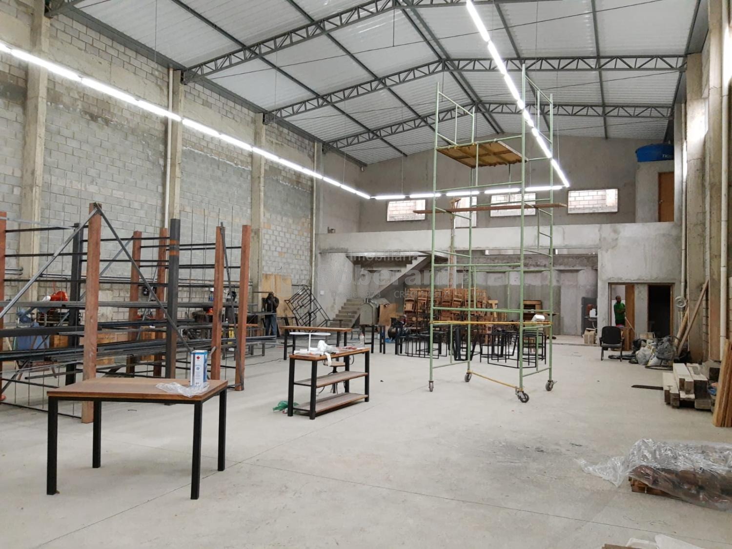 Mezanino com 4 m, para montar escritório com banheiro, amplo salão com copa e 2 banheiros.