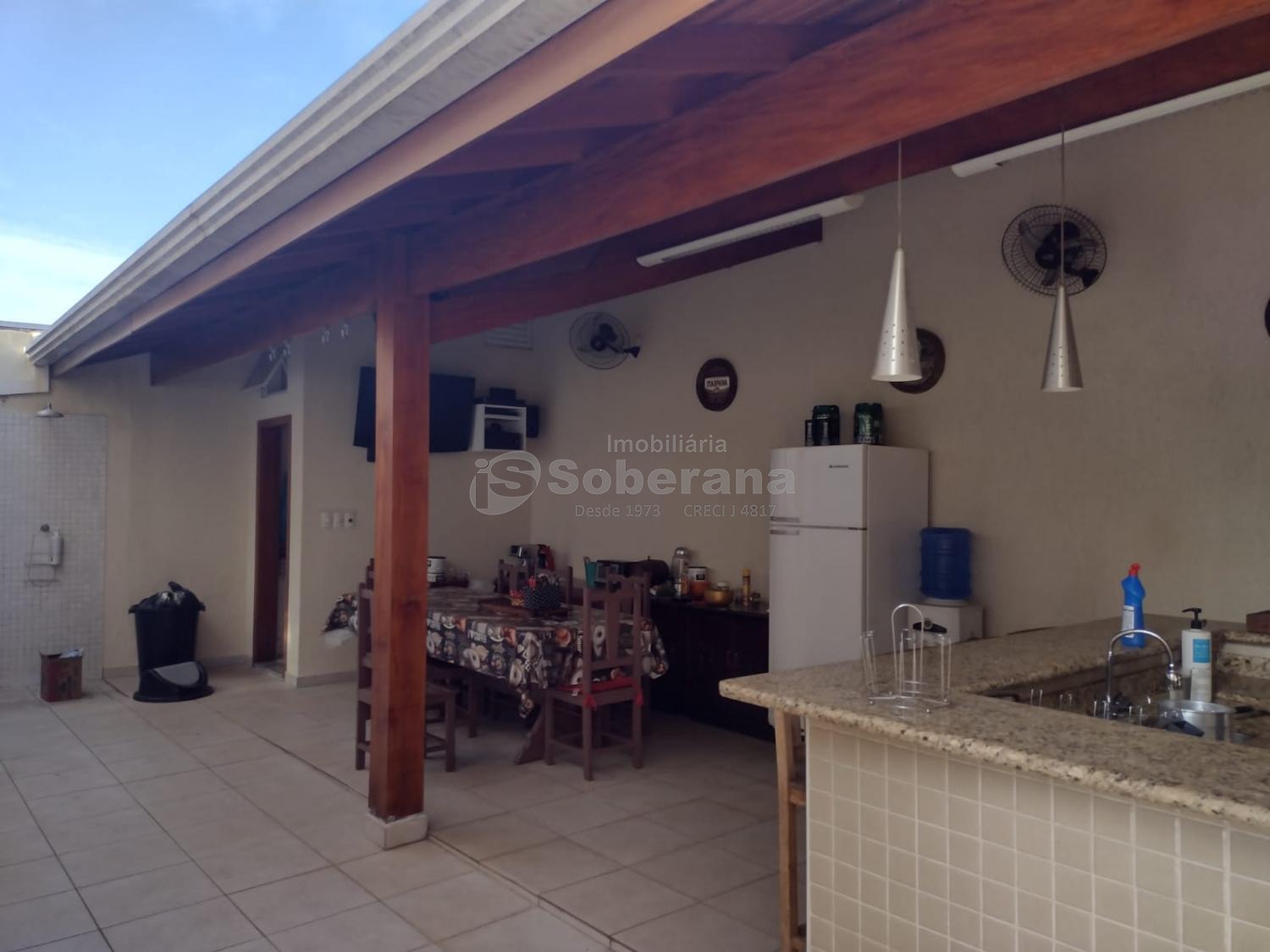 Área Gourmet coberta com telhas de barro que oferece uma temperatura agradável, churrasqueira e banheiro para visitas.